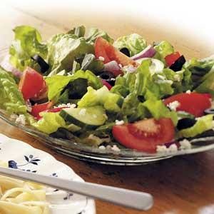 In a small bowl, combine the lettuce, tomato, cucumber, radishes, onion, olives and feta cheese. In a jar with a tight-fitting lid, combine the dressing ingredients; shake well. Drizzle over salad and toss to coat. Serve immediately. Yield: 2 servings.