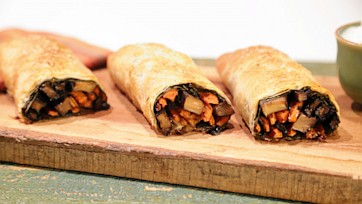 On a clean work surface, lay out one piece of phyllo. Using a pastry brush, brush phyllo with butter and sprinkle with chopped dill. Repeat with 3 more layers of phyllo with butter and dill in between each layer. Top the bottom half of the layered phyllo with an even layer of grape leaves. Top grape leaves with roasted mushrooms and carrots, shingling them in a line. Tightly roll into a log, like a jellyroll, brushing with butter along the way. Tuck the ends underneath. Cut in half.