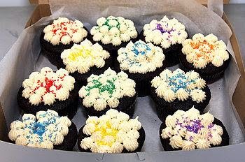 Ice and decorate the cupcakes. [I used a star tip and made little "poofs" everywhere and sprinkled it with various colors of sanding sugar to keep it looking festive for New Years. I bet shaved dark and white chocolates would look gorgeous as well.]