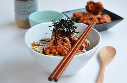 4. Add chicken karaage, drizzle a little kewpie mayonnaise, garnish with nori and serve.