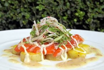 Heat sliced salmon on a parchment-lined baking sheet until just warm; salmon should be blue rare. Dress potatoes with horseradish vinaigrette and place in the centre of a plate. Place salmon and drizzle with Dijon dill mayo in a zigzag pattern. Toss micro cilantro with lemon juice and place on top to garnish.