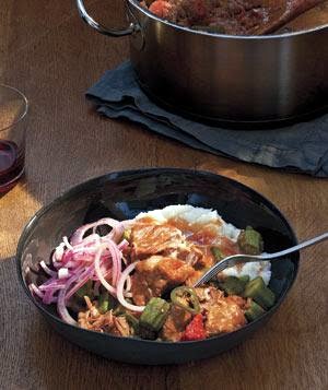 Skim and discard any fat from the stew. Add the okra. Cover the pot, return it to oven, and cook until the okra is tender, about 15 minutes. If the stew is too thin, place the pot on the stove and simmer, uncovered, until thickened, 5 to 10 minutes more.