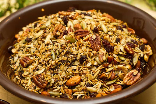 When ready remove and toss with the dried fruit and cocoa nibs. Once cool store in an airtight container.