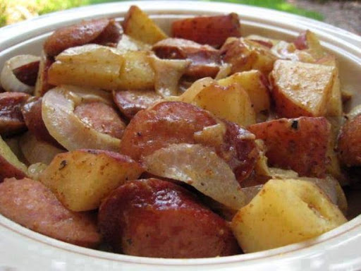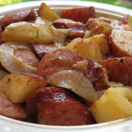 In large roasting pan, combine kielbasa, potatoes, onion and mustard mixture