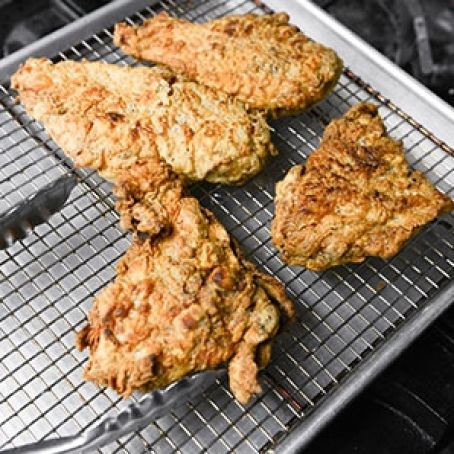 Working one piece at a time, dip chicken in buttermilk mixture, allowing excess to drip off. Coat in dredge, pressing to coat and shaking off excess.