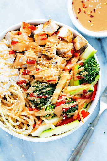 Assemble bowls with rice (or noodles) on the bottom, then top with veggies and chicken. Serve with bali island sauce and sprinkle with sesame seeds if desired.
