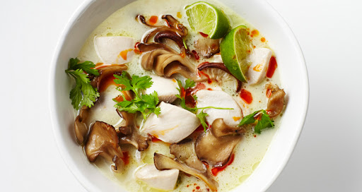 Add chicken and return to a boil. Reduce heat, add mushrooms, and simmer, skimming occasionally, until chicken is cooked through and mushrooms are soft, 20–25 minutes. Mix in coconut milk, fish sauce, and sugar.