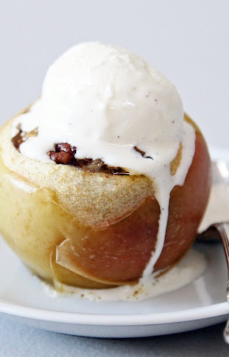 3. Remove from microwave, remove wrap, and spoon the collected “syrup” back onto top of apple. Slightly split open the apple and top with ice cream.
