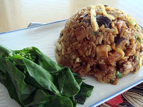 Using a frying pan at high heat, saute the cured meats with mushroom and dried shrimps until fragrant. Remove from pan and set aside.