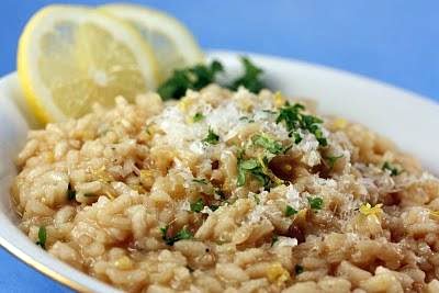 In a large frying pan heat butter and olive oil, saute onions for a few minutes, then stir in garlic. Add rice and toast for 2-3 minutes, stirring. With the heat on low, slowly add a little of the heated broth at a time; when liquid is almost gone, add a little more. This process should take about 20-25 minutes. Stir in lemon zest and juice, then add cheese, salt and pepper. Serve immediately.