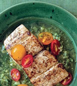 Gazpacho (a traditional chilled soup that originated in Spain) becomes a sauce for fish fillets.