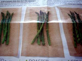 Heat oven to 425 degrees F. On a rimmed baking sheet toss trimmed asparagus with 1 Tbsp olive oil and 1/4 tsp. salt and pepper. Roast until tender - about 8-10 minutes (depending on thickness).