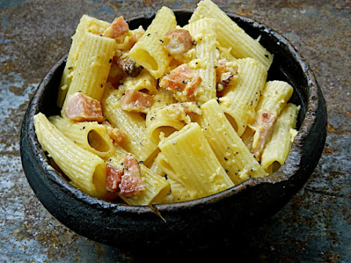 (pasta cooking water) if it looks like it’s drying. Add a little more cheese to bring the temperature down and amalgamate. The residual heat of the pan and of the rigatoni, along with the pasta cooking liquor, will cook the eggs, but will keep it creamy in texture.