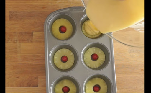When it’s golden brown, pop it out of the oven and let cool for a few minutes. Flip it out of the muffin tin and serve with the pineapple side facing up.