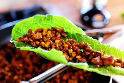Pile mixture into romaine hearts, then add sliced of avocado. Fold up and chow down!