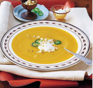 Puree in batches in a food processor or blender until smooth, and return to saucepan. Heat over low, thinning with more water if necessary. To serve, ladle into shallow bowls; garnish with diced apples, jalapeno slices, and sour cream if desired.