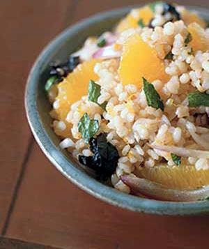3.When rice is tender and the water is absorbed, fold in the 1 tablespoon of peel, the orange sections, onion, mint, olives, and olive oil. Season to taste with additional salt if necessary.