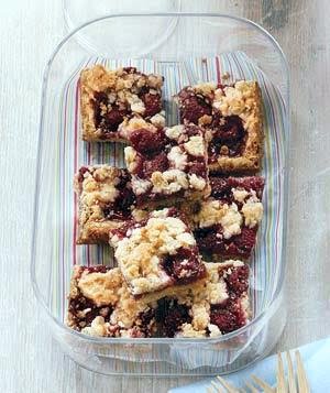 2.Press all but 1/2 cup of the dough into the prepared pan. Spread the jam evenly over the dough, leaving a 1/4-inch border around the edges. Scatter the raspberries over the jam and sprinkle with the remaining dough.