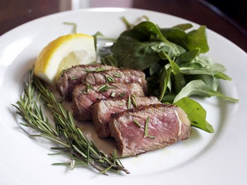 3. Slice the steak against the grain. Place the meat on a platter with the arugula on side. Drizzle some olive oil over the meat and arugula, along with a sprinkling of rosemary. Squeeze some lemon juice over the arugula and serve.