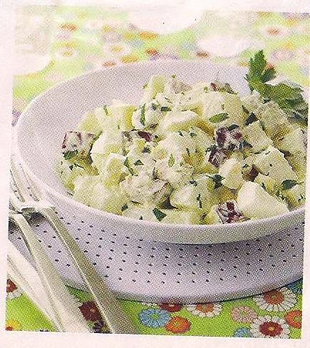 -In large bowl,mix together the potatoes,ham,egg,apple,cucumber,onion,salad dressing,salt and pepper