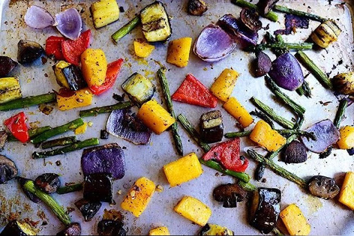 Arrange on two baking sheets, spreading the veggies out to give them room. Roast for 20 minutes, shaking the pans at least twice during that time. If needed, roast for an additional 5-10 minutes, until veggies are nicely roasted.