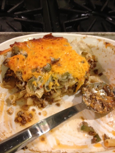 THEN MARCONI, MEAT, MUSHROOM SOUP, THEN REMAINING CHEESE.