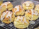 Brush the tops of the scones with egg wash, sprinkle with sugar, and bake for 20 to 25 minutes, until the tops are browned and the insides are fully baked. The scones will be firm to the touch. Allow the scones to cool for 15 minutes and then whisk together the confectioners' sugar and orange juice, and drizzle over the scones.