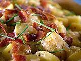 Whisk in the vinegar, sugar, mustard, and salt and stir until thick and bubbly. Add the sliced, cooked potatoes and toss to coat. Top with the crumbled bacon and garnish with the chives. Serve warm.
