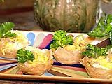 Butter 4 muffin cups. In a small bowl, combine melted butter and garlic. On a cutting board, stack 3 phyllo sheets and cut into fourths, forming 12 squares. Cover phyllo with a damp paper towel when not in use because it dries out quickly. Press 1 phyllo square (one sheet thick) into bottom of each muffin cup. (Don't worry if phyllo tears) Brush with butter. Add another layer of phyllo and brush with butter. Repeat a third time. Bake for 10 minutes. Carefully remove phyllo baskets from muffin cups and cool on wire rack. In a medium bowl, beat eggs and add 1 tablespoon water. Melt 2 tablespoons butter in a medium skillet and add eggs. Sprinkle ham over eggs. Scramble eggs to desired doneness. Sprinkle in cheese and stir until melted. Season with salt and pepper and spoon into phyllo baskets.