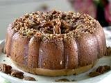 Once cake is ready, take out of oven and leave in pan. Gently prick holes into the cake with a skewer. Slowly pour half of the glaze over the cake making sure to fill in all the holes. Once the cake has soaked up the glaze, turn cake over, removing pan, onto the base that the cake will stay on. Gently prick more holes on other side and slowly pour other half of glaze over cake. Fill the center of the cake with reserved pecans. Let cool and enjoy. The cake is best if left at room temperature.