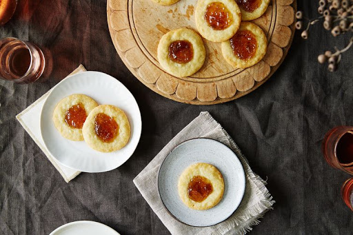 Using the back or a round half-teaspoon measure or your knuckle, make an indentation in the top of each dough round. Spoon about ¼ teaspoon of fig preserves into each indentation, using your finger to push the preserves as best as possible into the indentations.