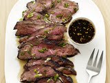 Preheat the broiler with a broiler pan in place. Remove the steak from the bag and reserve the marinade. Pat the meat dry and place on a preheated broiler pan. Cook without turning, until the meat is golden brown and a thermometer inserted in the thickest part registers 130 degrees for medium-rare, about 10 minutes. Let rest 5 to 10 minutes before slicing; reserve the drippings.