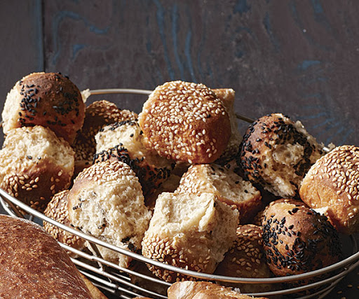 Put the seeds in separate bowls. Shape the pieces of dough into balls. Roll 8 balls in each type of seed, and then transfer them to the baking dish in a random pattern. They should fill the pan, but gaps and overlap between rolls are OK. Don't pack the rolls in too tightly. They need room to rise, so it's also fine to make more than one layer.