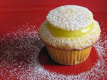 4. When the cupcakes are completely cooled, use a sharp paring knife to cut the tops off as shown. Fill the cupcake with the warm filling. Press the cake top in the filling. Make sure it's not on crooked. The filling will thicken as it cools. Dust the cupcakes with confectioner's sugar.