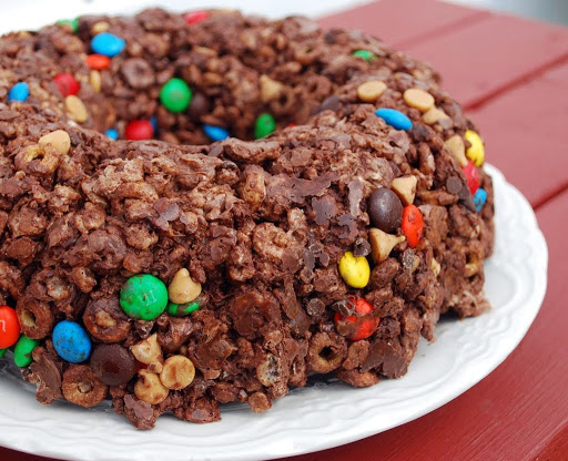 Spray a 10 – 12 cup Bundt pan with cooking spray. In a large bowl heat the chocolate and butter in the microwave on high for 1 minute, stirring once during heating. Remove and stir until melted and smooth. Add the marshmallows to the mixture. Heat in microwave on high 1 minute longer, or until mixture is smooth.