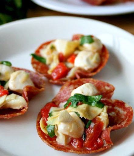 Place the salami cups on a platter. Fill with the vegetable mixture. Top with more chopped basil.