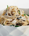 In a large pot of boiling salted water, cook the fettuccine until al dente. Reserve 3/4 cup of the pasta cooking water and drain the fettuccine well.