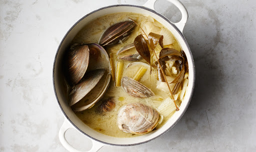 Add clams and wine and increase heat to medium-high. Cover and cook until clams open, 12–15 minutes. Add coconut milk and 1 cup water. Bring to a boil, then reduce heat and simmer 15 minutes.