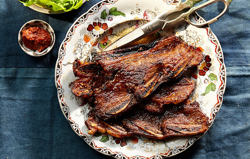 - 2 pounds 1/4”-thick cross-cut bone-in beef short ribs (flanken style)