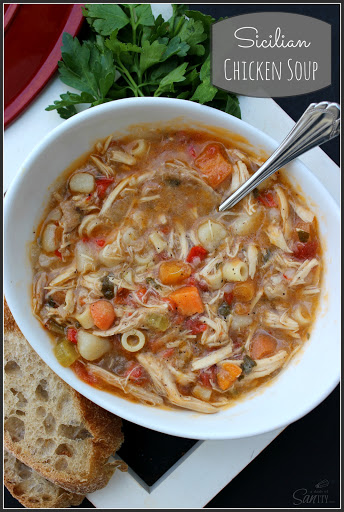 In a large soup pot place whole chicken, onion, red peppers, celery, carrots, potatoes, diced tomatoes with their juices and then add enough cold water to cover by 1 inch. Over high heat bring to a boil. Then add parsley, garlic, 1 tablespoon of salt and pepper.