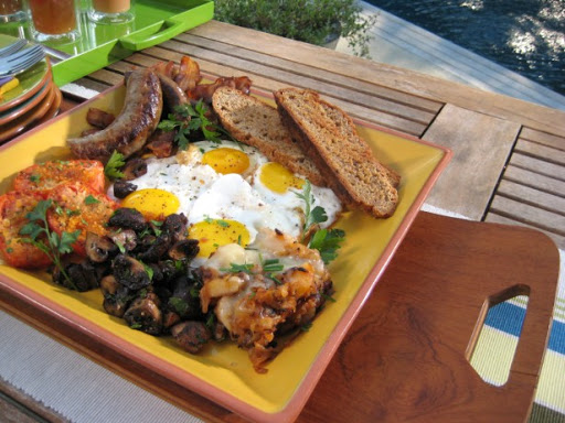 For serving: Arrange on a platter the fried eggs, cooked bacon, cooked sausage, cheesy hash browns, roasted tomatoes, sauteed mushrooms, toasted brown soda bread and butter.