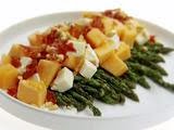 Arrange the asparagus on a platter. Using a slotted spoon, spoon the melon and burrata cheese on top of the asparagus. Drizzle any remaining vinaigrette over the top. Sprinkle the prosciutto and pine nuts on top and serve.