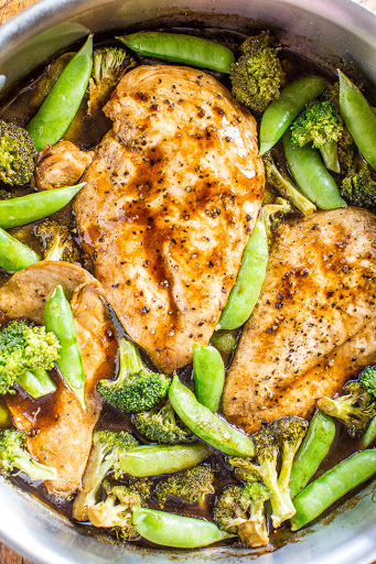 Add the vegetables, evenly sprinkled over the skillet, some will be on top of the chicken. If necessary add 2 to 4 tablespoons water to help the vegetables steam. Adding water will vary based on the amount of natural juices the chicken released while cooking. Cover skillet and allow vegetables to steam for about 3 to 5 minutes, or until crisp-tender and chicken is cooked through. Stir to evenly coat vegetables with sauce.