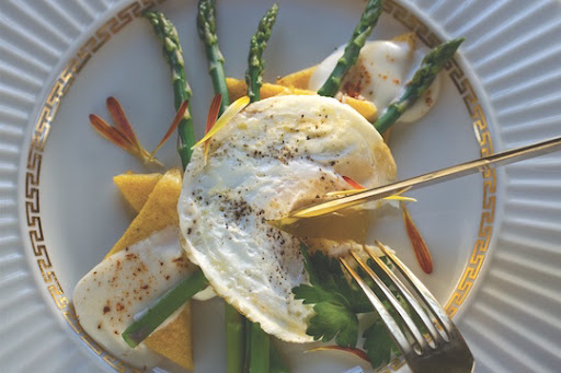 Fried Polenta, Asparagus, Hen Egg, and Spicy Goat Cheese