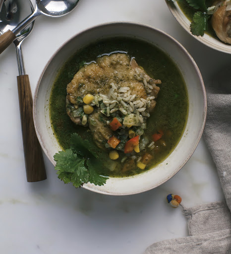 Add the rice and cilantro liquid mixture to the pot and mix, being sure to completely coat the rice. Gently add the chicken back to the pot and cover with about 3 1/2 cups of chicken broth. The broth should almost cover the chicken. Bring the soup to a simmer and then immediately turn the heat down to medium low. Cover the pot and cook for 20-30 minutes, and until rice is fully cooked.