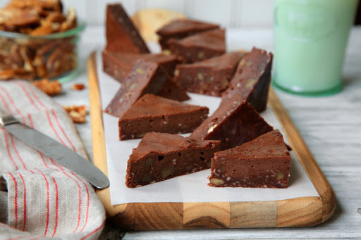 9. Cut into 16 large squares or 32 bars or triangles, wiping the blade with a damp cloth between cuttings. These may be wrapped individually in clear plastic wrap. But if they are not going to kept cold, using a sieve, sprinkle cocoa over the tops before wrapping to prevent sticking. Store these in the refrigerator or the freezer. They may be served frozen.