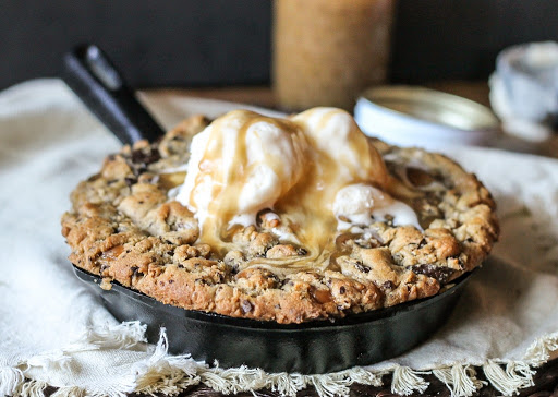 Salted Caramel Filled Dark Chocolate Chunk Skillet Cookie