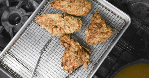 After removing the chicken from the grease and placing it on a rack, a home cook can do two things: finish it off in the oven at 350° for six minutes; or, if the host wants to entertain guests, hold it at 250° for 1 to 1½ hours in the oven. This decreases the risk of serving greasy chicken.
