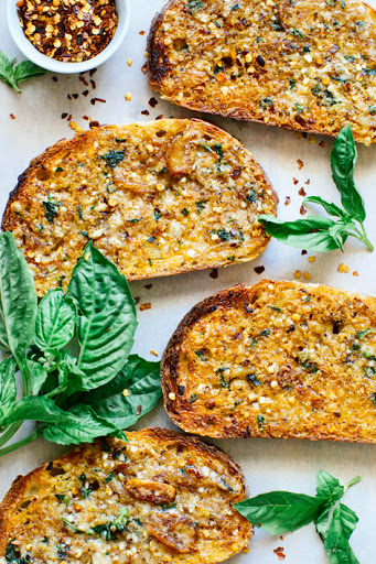 Preheat broiler. Place desired bread on a baking sheet, and toast under the broiler until golden (about 2 minutes). Flip the slices, and broil the other side until golden (another 2 minutes). Remove the baking sheet from under the broiler, and let the bread cool slightly. Once cool enough to handle, slather the top of each slice of bread with the garlic-butter mixture, and return to the broiler. Cook until the cheese is golden and bubbling (about 2 minutes).