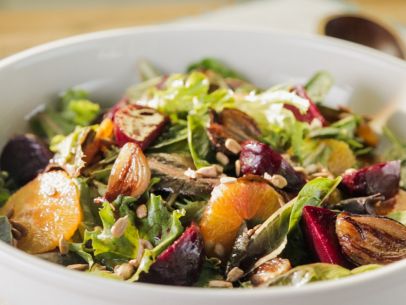 In a small bowl, whisk together the vinegar, sugar, mustard, some salt and pepper, and the remaining 3 tablespoons olive oil. Pour the dressing over the beets and shallots; toss to combine. Add the mixed greens and the orange slices; toss again. Sprinkle with sunflower seeds.
